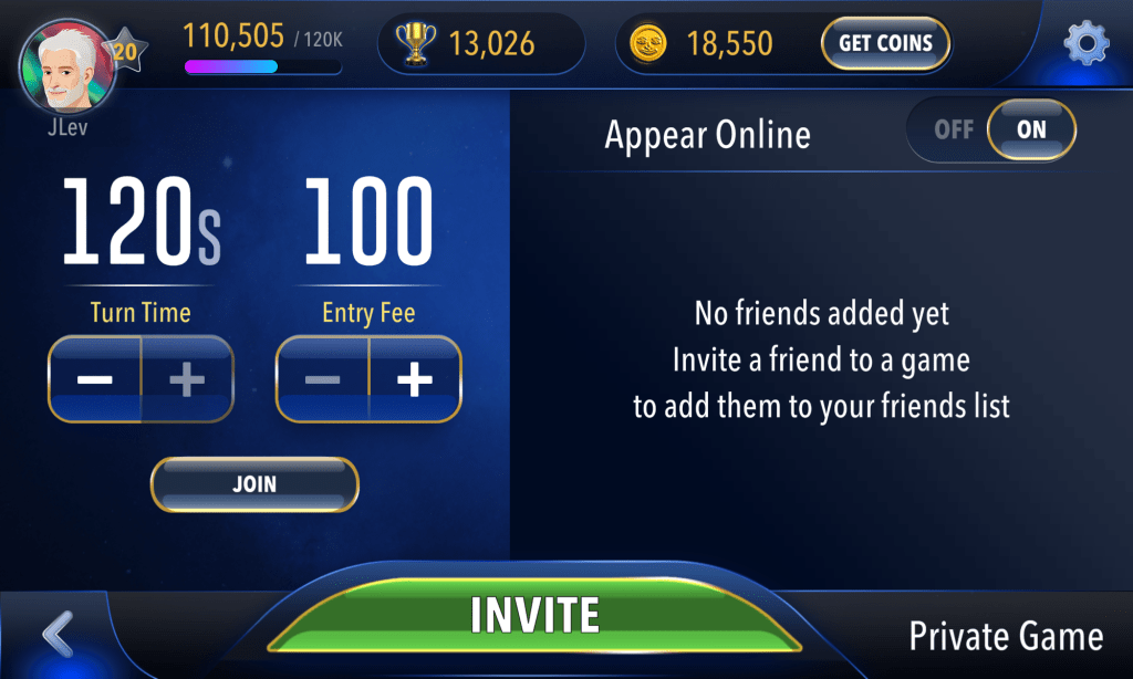 The league can also experiment with creating games among others in the league on the official Rummikub app. In the app, you are able to create a custom game and invite people with a unique code: